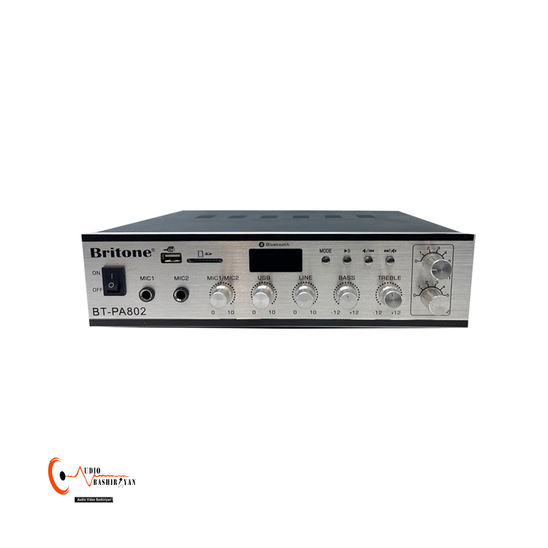 آمپلی فایر اهمی ولتی رومیزی دارای 200 وات قدرت خروجی با 2 ورودی میکروفن، بلوتوث و AUX دو کنترل ولوم مجزا تریبل و بیس صدا بسیار مناسب برای مراسمات، مدارس و …. میباشد.