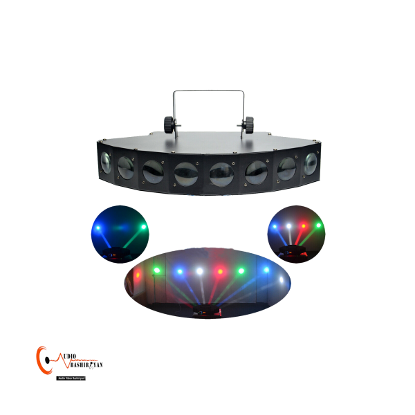 افکت ال ای دی 8 چشم از پرقدرت ترین تجهیزات نور مجالس حال حاضر بازار تجهیزات حرفه ای نور می باشد. LED هشت چشم دارای توانایی ساخت طیف های نوری مختلف با افکت های مختلف و متنوع رنگی را دارد. افکت هشت چشم میتوانید برای نورپردازی های مجالس و یا سالن های موسیقی استفاده نمائید. این محصول دارای قابلیت حساسیت به صدا و همچنین قابلیت اتصال DMX را نیز دارا میباشد. جنس بدنه این دستگاه از جنس فلز می باشد و البته جنس بدنه افکت 8 چشم ضد خش میباشد. افکت led هشت چشم یکی از محبوبترین دستگاه ها برای ایجاد افکت صحنه میباشد. این دستگاه از هشت ال ای دی بسیار پر قدرت تهیه و تشکیل شده است که توانایی تولید حجم نور بسیار زیادی را در خود جای داده است. معمولا در کنسرت ها برای ایجاد حجم نور زیاد و لحظه ای از افکت بیم هشت چشم استفاده میشود.