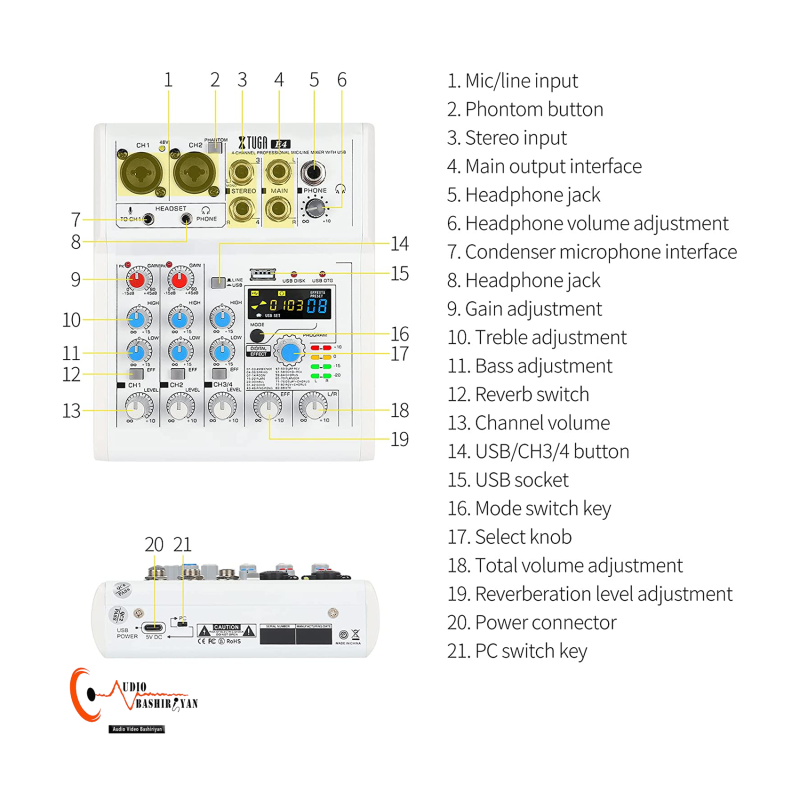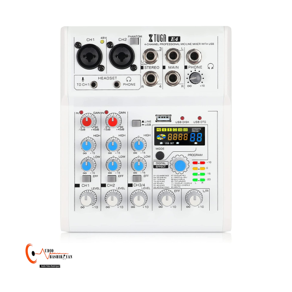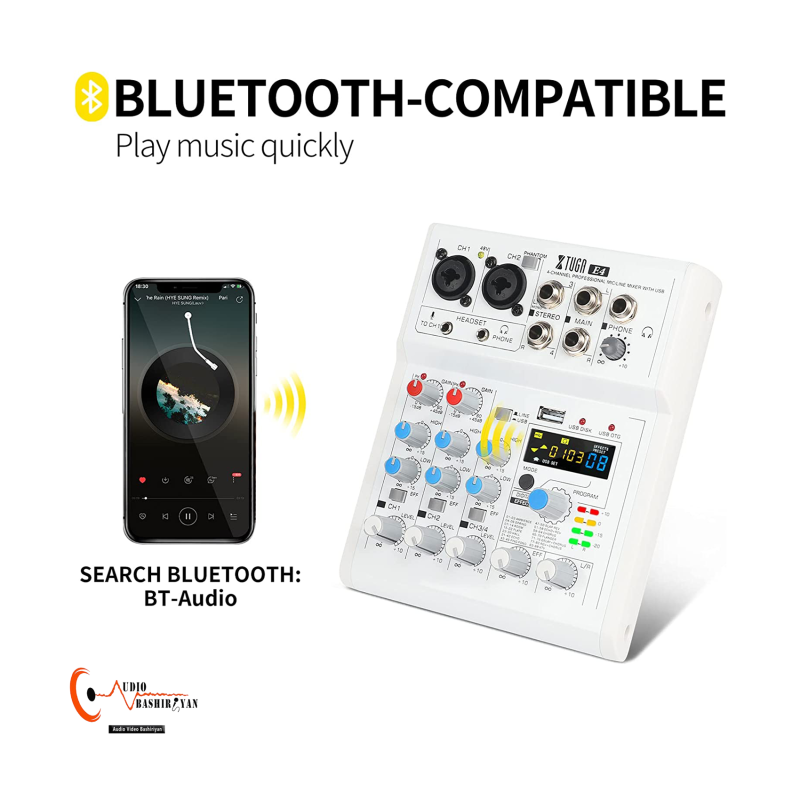 مینی میکسر 4 کانال پارتی سوند دارای ورودی میکروفن و هدفون با قابلیت اتصال بلوتوث و USB و ظاهر زیبا یک میکسر ایده آل برای استفاده خانگی و استودیویی میباشد.