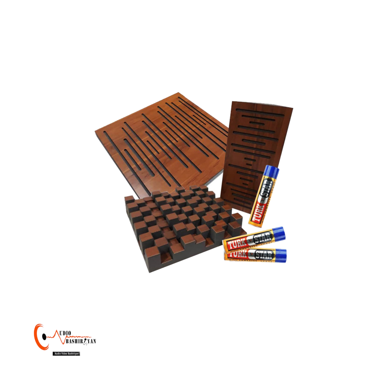 پکیج آکوستیک Acoustic Package Ver.2 دارای 20 عدد پنل Wave Wood Absorption جذب کننده ، 8 عدد پنل Wood پخش کننده، 8 عدد Wave Wood بیس ترپ و 10 عدد چسب اسپری