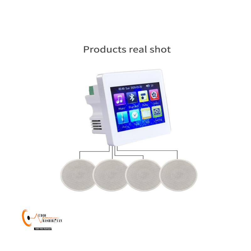 پلیر مخصوص بلندگوی سقفی مدل ۴ اینچ خانگی، تمام صفحه لمسی، دارای صفحه رنگی، قابلیت پخش فایل تصویری، ورودی AUX،RAM،OTG،BLUETOOTH