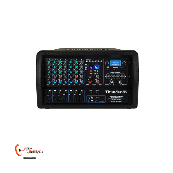 آمپلی فایر 1400 وات تندرالکترونیک، 2 کانال آمپلی فایر مجزا هریک به قدرت 700 وات، اکوی 60 برنامه، میکسر 7 کاناله همراه با 3 باند اکولایزر.