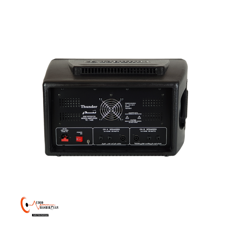 آمپلی فایر 1400 وات تندرالکترونیک، 2 کانال آمپلی فایر مجزا هریک به قدرت 700 وات، اکوی 60 برنامه، میکسر 7 کاناله همراه با 3 باند اکولایزر.