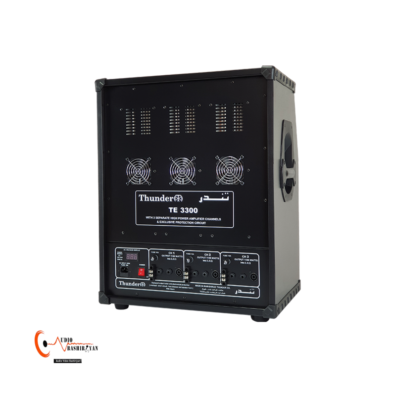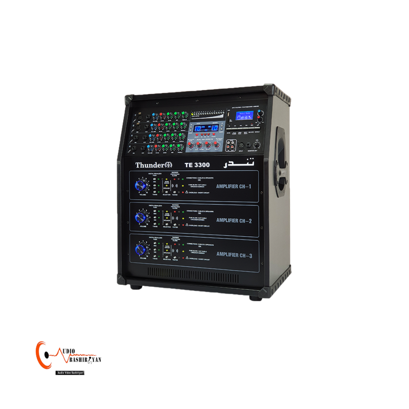 دستگاه تندر 3300 یک آمپلی فایر قدرتمند دارای سه آمپلی فایر 1100 وات مجزا با قابلیت هایی نظیر برد USB دیجیتال با قابلیت های اتصال USB، بلوتوث، ضبط صدا و رادیو می باشد. همچنین از خصوصیات دیگر این دستگاه می توان به افکت دیجیتال با قابلیت تنظیم دستی اشاره کرد که می تواند انتخاب خوبی برای هیئت ها و مساجد و … باشد.