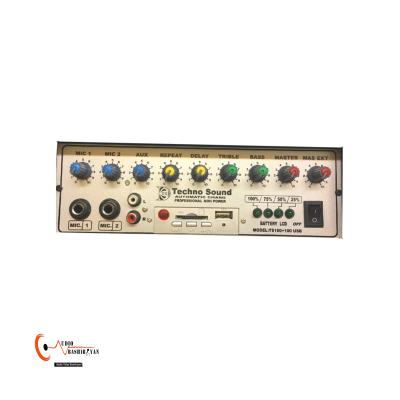 اکو شارژی تکنوسوند مدل TS100 سایز 6 اینچ وزن کمی داشته و بسیار سبک است و شامل دو ورودی میکروفون باسیم و 1 ورودی لاین، دارای درگاه USB و SD CARD سیستم پخش می باشد. این اکو با مشخصاتی که دارد مناسب برای مدارس، کنفرانس ها، سخنرانی ها، اردوها و برنامه های مذهبی می باشد.